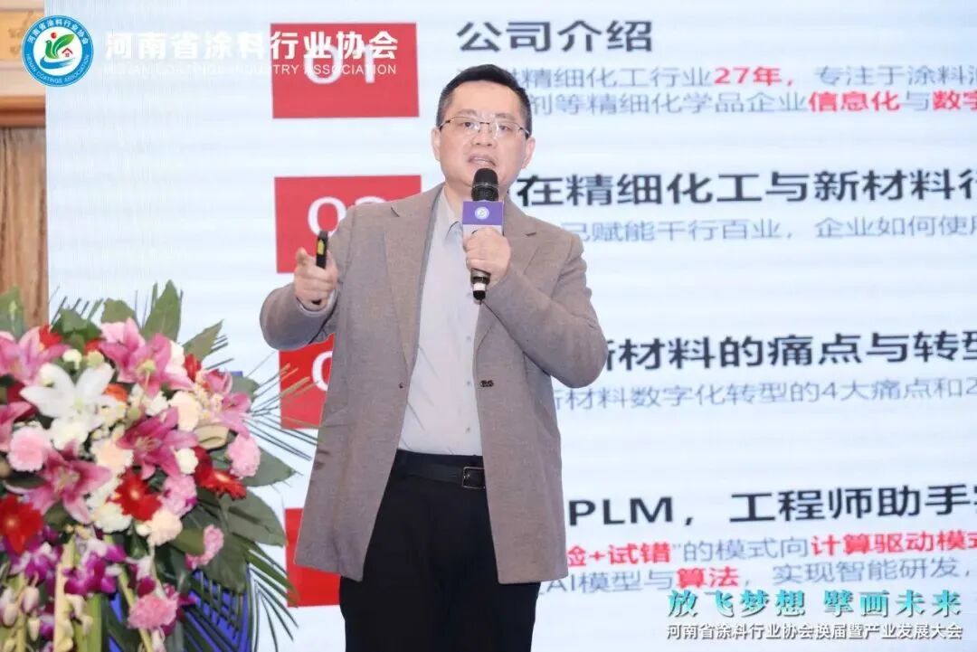 在数字化转型大会上,濮阳展辰新材料有限公司副总经理田军、秦皇岛黑豆环保科技有限公司副总经理丁世锐、广东政和工程有限公司总经理曾天鹰、祈业(佛山)软件有限公司总经理、广东省涂料与油墨行业协会数字化产业联盟秘书长刘浩亮、广东金宗机械有限公司事业部总经理钟声宏、重庆渝辉智能装备有限公司销售总监梁正文、河南省工业与信息化厅数字未来处科长王瑞方分别作《数字化转型助力企业提升新质生产力》《制漆行业的环保智能化处理方案选择》《精细化工建设项目管理痛点及解决方案》《企业级AI+小快轻准数字化转型方案,驱动新材料企业的未来》《数字化工厂关键设备的应用与探索》《与行业共发展—涂料生产设备的进化汇报》《河南省加快数字化转型推动制造业高端化智能化绿色化发展行动计划(2023—2025年)》课题报告,会议围绕国家政策、企业创新增长模式,数字化、智能化转型等课题进行讲解、分析和研讨,会议由河南颂源涂料有限公司总经理张超然主持。