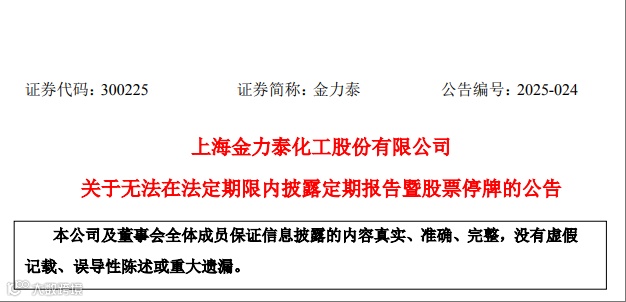 因此,金力泰无法在法定期限内(2025年4月30日)披露2024年年度报告及2025年第一季度报告。根据《深圳证券交易所创业板股票上市规则》的相关规定,金力泰股票于2025年5月6日开市起停牌。