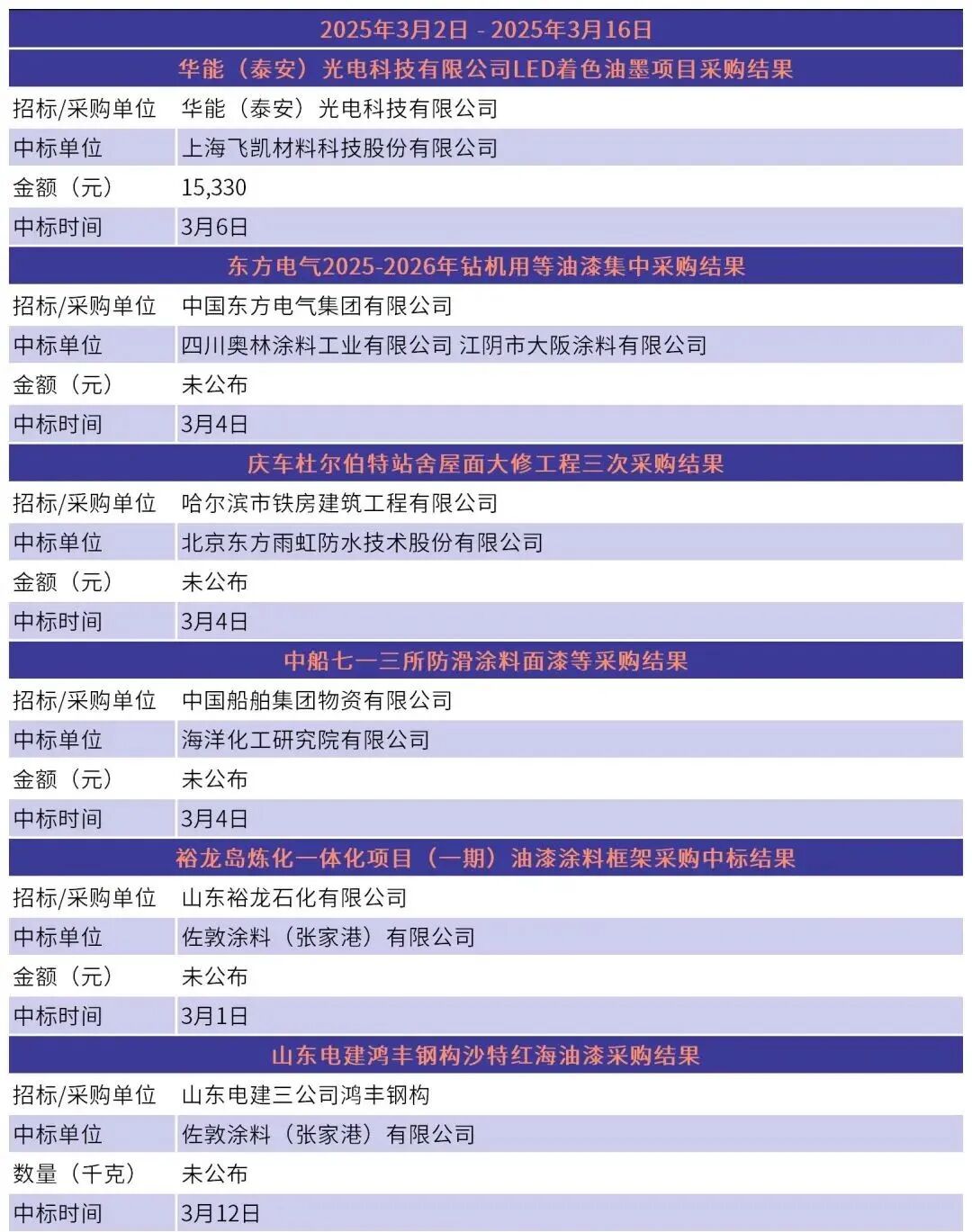 慧正资讯,3月2日至3月16日期间,上海飞凯、四川奥林、江阴大阪、东方雨虹、海化院、佐敦、宝塔山、立邦、富思特、西北永新等中标信息相继发布。
