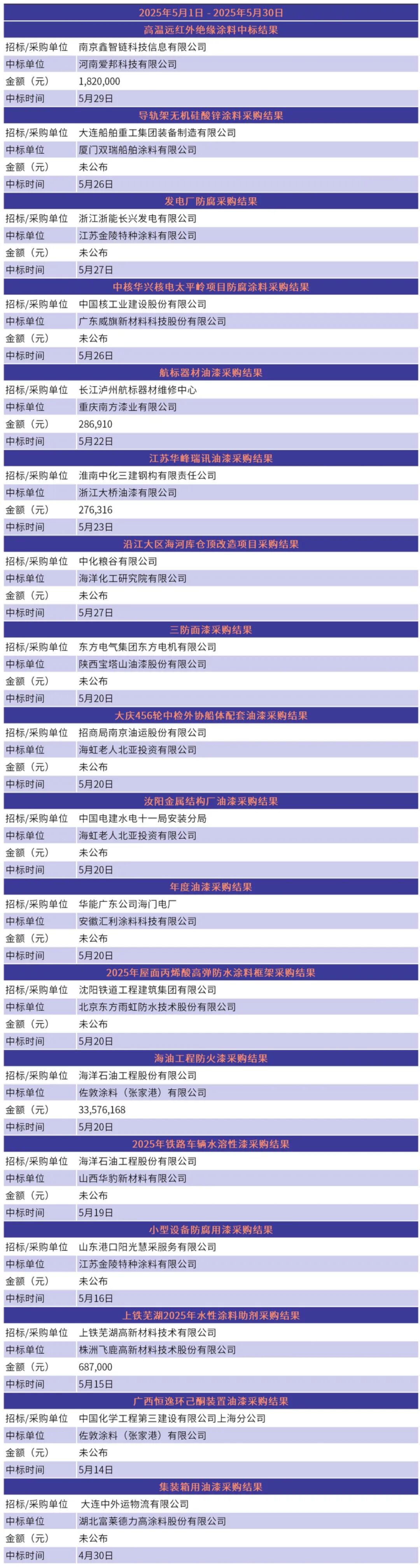 慧正资讯,5月1日至5月30日期间,河南爱邦、厦门双瑞、广东威旗、重庆南方漆业、浙江大桥油漆、海洋化工研究院、陕西宝塔山油漆、海虹老人、安徽汇利、东方雨虹、佐敦涂料、山西华豹、江苏金陵、株洲飞鹿、湖北富莱德力高等中标信息相继发布。