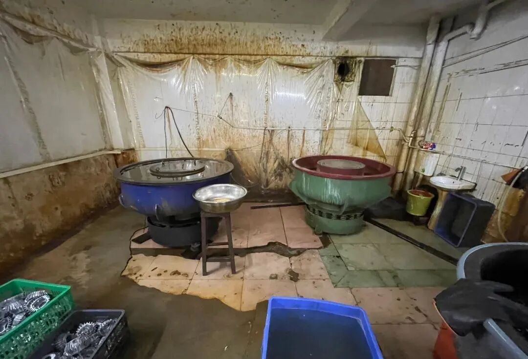 另一家偷排企业在林村,执法人员在排查截污管网时发现一污水渠有白色废水流出,根据水流走向进行溯源,执法人员立即锁定目标为某工业园分租厂房二楼的一家“散乱污”企业正在生产。现场检查时发现,该企业研磨工序产生的废水未配套污染防治设施,研磨废水经地面汇集后流入PVC管道连接至一楼污水渠引至厂外污水管网。