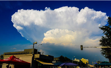 上个周末,北京天气晴朗,天空蓝、白云白,着实让人开心。一位北大的同学举起相机拍了一张以天空为主体的照片,发到了自己的人人网主页上,并附言曰:“今天5点北大东门的蘑菇云~~像清华被炸了啊~~”。