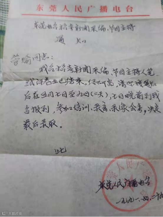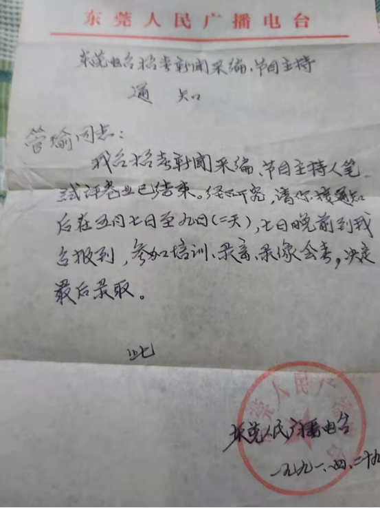 管管前辈说,1990年318东莞电台呼号开播。1991年,领中国开放之先的东莞电台在各大媒体发布招聘信息,公开从全国招聘采编主持等人员。我就是1991年初公开招聘中,经过公开面试笔试专业考核来到东莞电台的。当时24岁的我只身从广州来到东莞,到播音部报道。播音部是个年轻的集体,苏蔓,夏穗萦比我年轻,却都已经是我的领导。我是上海戏剧学院毕业的,虽然所学与广播有一定的交集,比起苏蔓等老师在省台接受过专业培训的她们,我只算是业余段位。感谢电台同事包容帮助,让我在电台度过了六七年最难忘和青春的时光。