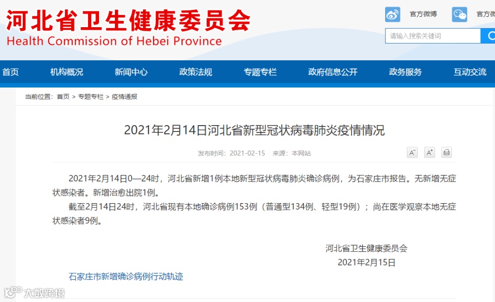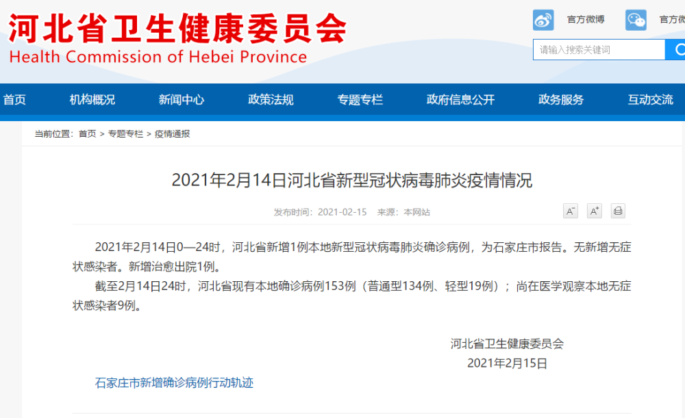 截至2月14日24时,河北省现有本地确诊病例153例(普通型134例、轻型19例);尚在医学观察本地无症状感染者9例。