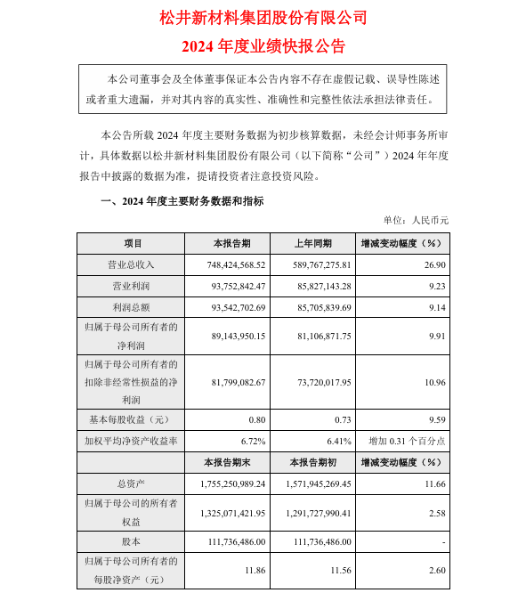 2月26日,松井新材料集团股份有限公司发布2024年度业绩快报。报告虽为初步核算数据且未经审计,但已展现出公司过去一年的良好发展态势,为市场和投资者提供了关键信息。
