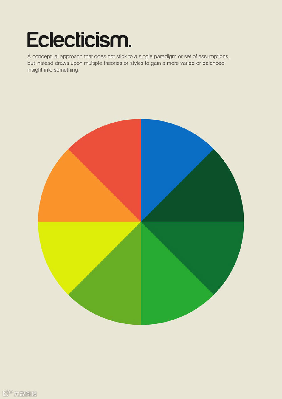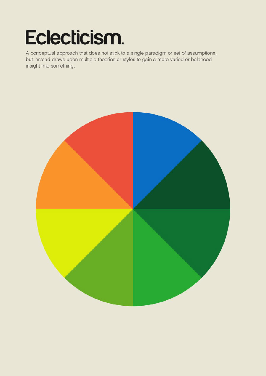 折衷主义是指操作运用不同的理论、方法、风格,拣选其中最佳要素,应用在新的创作中。在艺术或建筑批评等特定领域,指挪借多种视觉资源来创作新作品。
