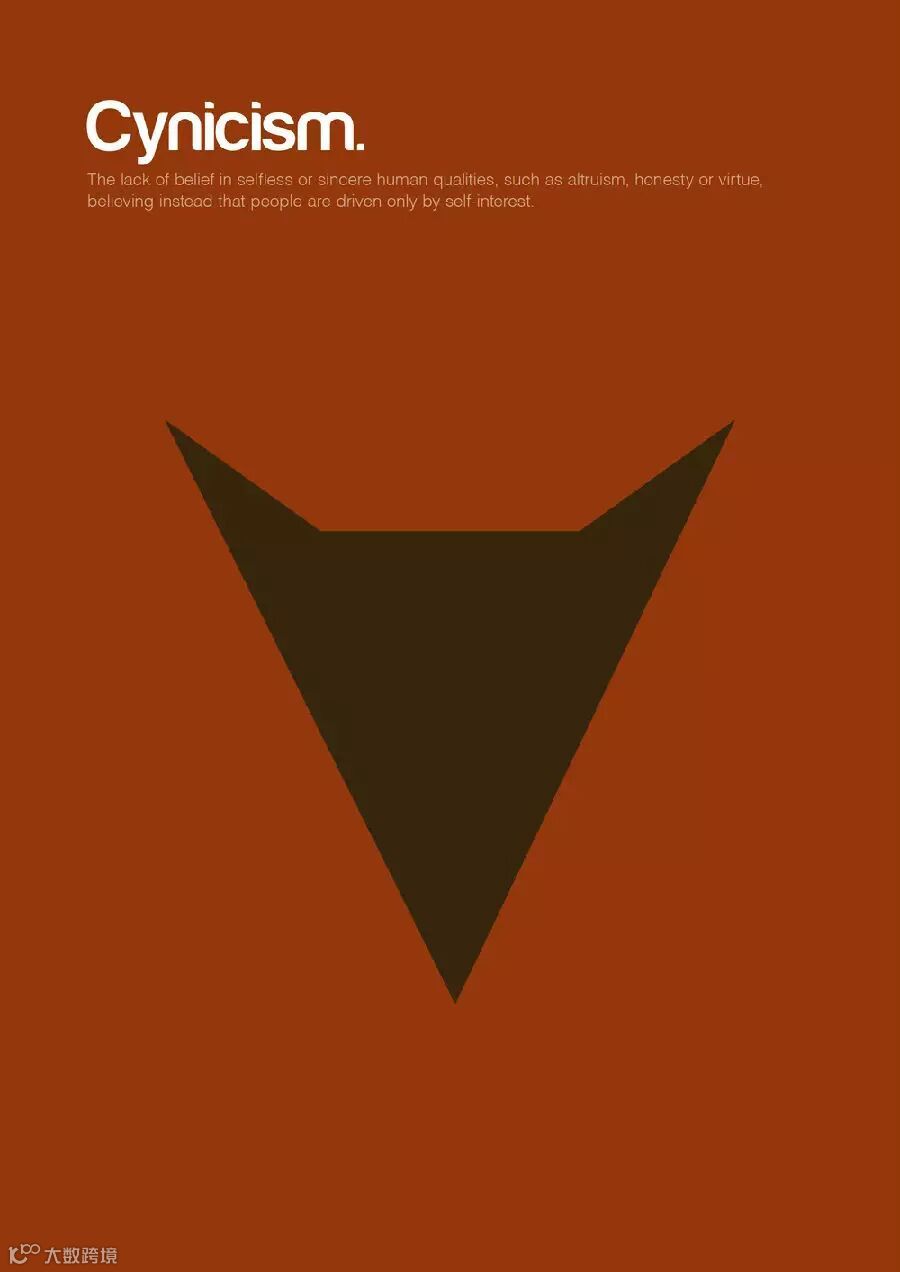 在现代社会中“犬儒主义”一词常被误用作比喻一些否定利他主义、自私而且毫无道德的人,也是该海报设计师所理解的含义。