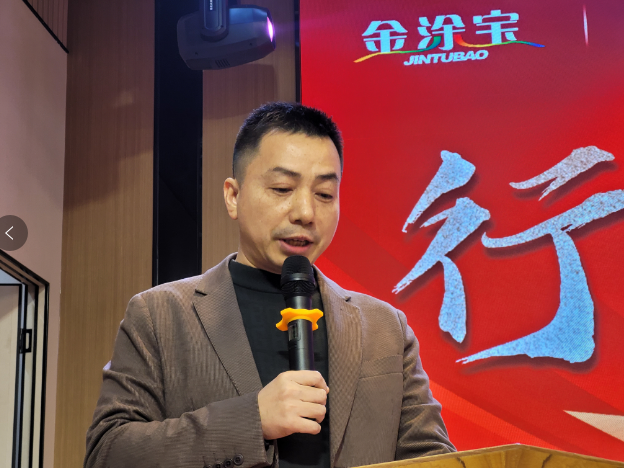 活动伊始,广东金涂宝新材料股份公司营销总经理燕卫涛发表了重要致辞。他首先向长期以来支持和信任公司的合作伙伴们表达了诚挚的谢意,正是得益于他们的坚定支持,金涂宝 - 华喆仿石漆才能在竞争激烈的涂料市场中保持稳健的发展态势。回顾过去一年,公司在市场拓展方面取得了显著突破,成功扩大了市场份额,产品影响力进一步提升。在产品创新领域,多系列外墙及内墙新品成功上市,这些新品凭借其卓越的品质和创新的设计,迅速赢得了消费者的青睐与好评,为公司的产品矩阵注入了新的活力。同时,公司积极引进先进生产设备并投入生产,通过对内部生产流程的优化,实现了产品质量和产量的双提升,有效增强了公司的生产实力。在质量管理方面,公司成绩斐然,连续荣获国家 ISO 体系认证及首批内墙涂料 3C 等多项国家权威认证,这不仅是对公司质量管理体系的高度认可,也为公司的持续发展奠定了坚实的基础。