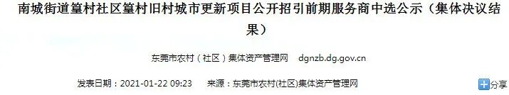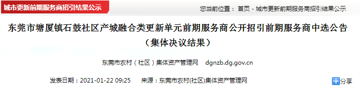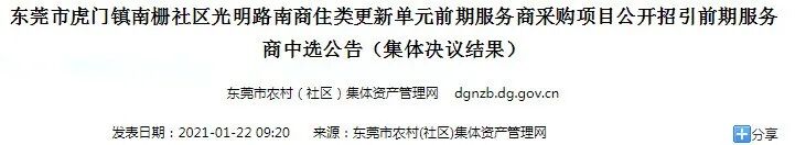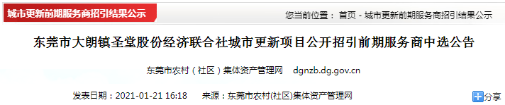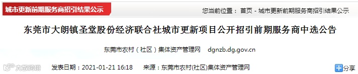 1月21日,大朗镇圣堂股份经济联合社城市更新项目(编号∶DLST001),确认“东莞市睿堂城市更新服务有限公司”为前期服务商。
