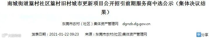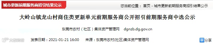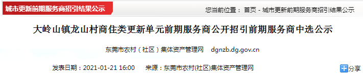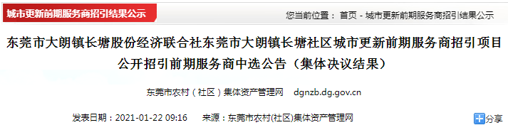 1月22日,东莞市大朗镇长塘股份经济联合社东莞市大朗镇长塘社区城市更新前期服务商招引项目(项目编号:YDZB20DGQY0222),确认“东莞市保润房地产开发有限公司”为项目的前期服务商。