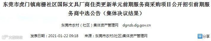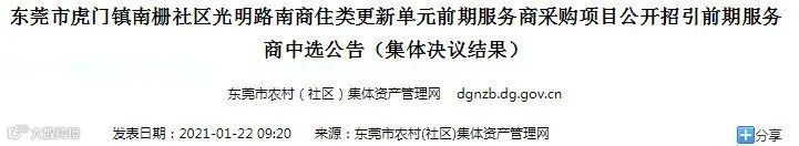 1月22日,虎门镇南栅社区两宗城市更新项目确认同一家公司——东莞市田耀实业投资发展有限公司,为前期服务商。