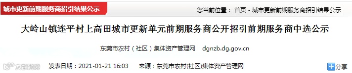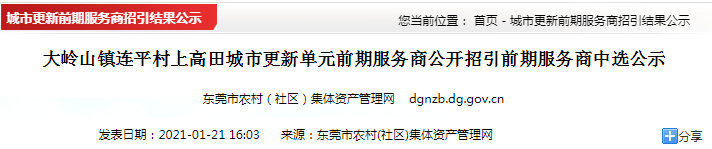 大岭山镇连平村上高田城市更新单元(编号:DLSLP-001)确认东莞市高田房地产开发有限公司公司为前期服务商。