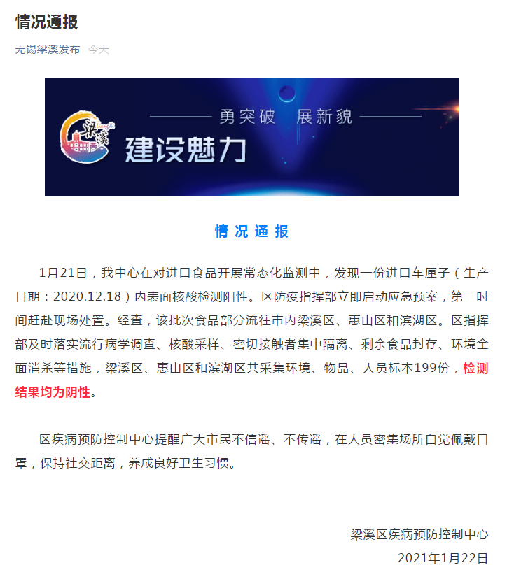发现一份进口车厘子(生产日期:2020.12.18)内表面核酸检测阳性。