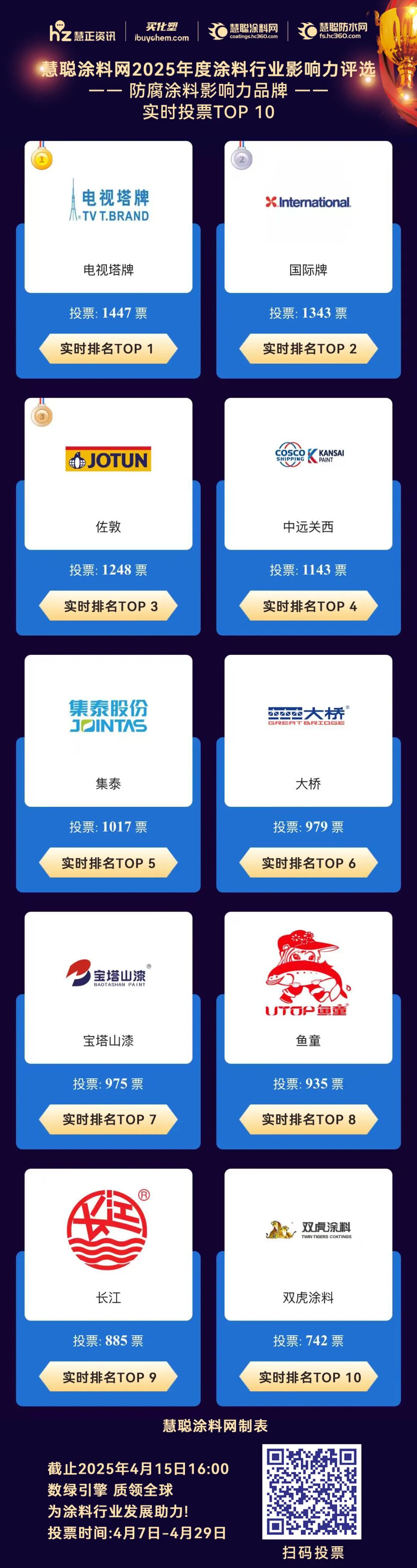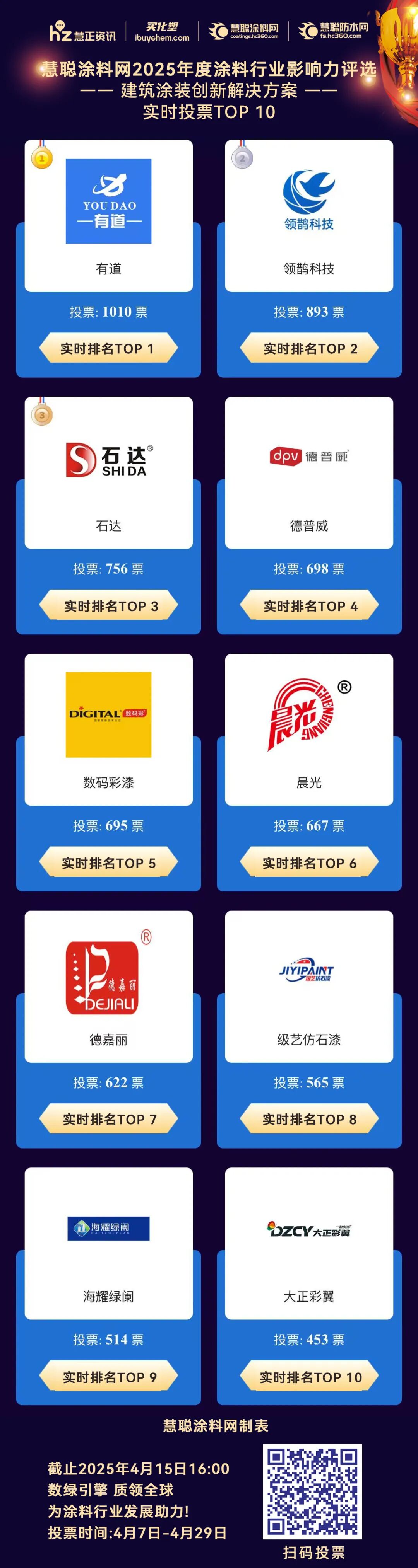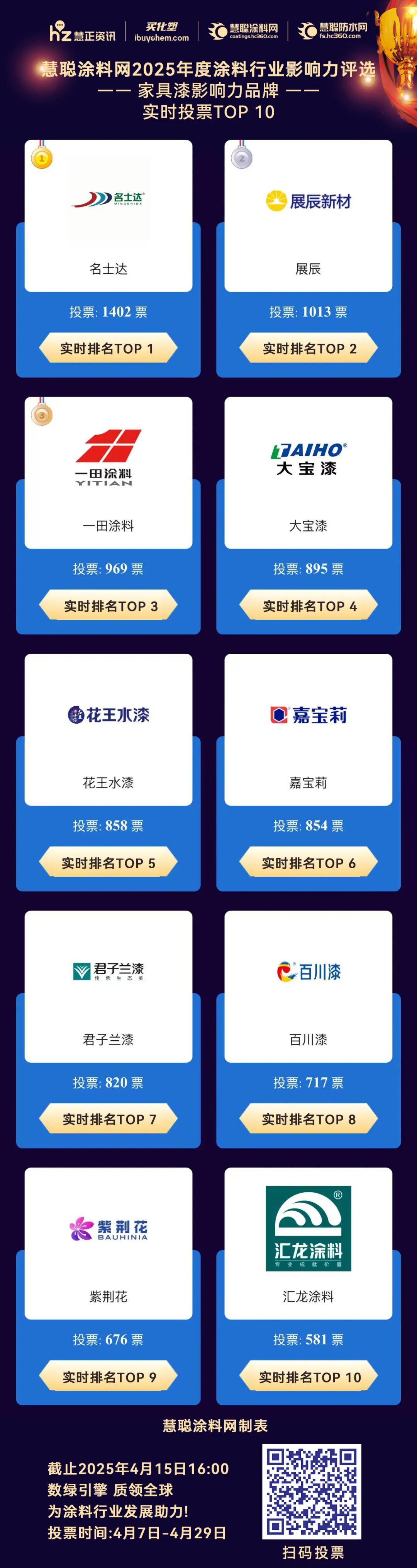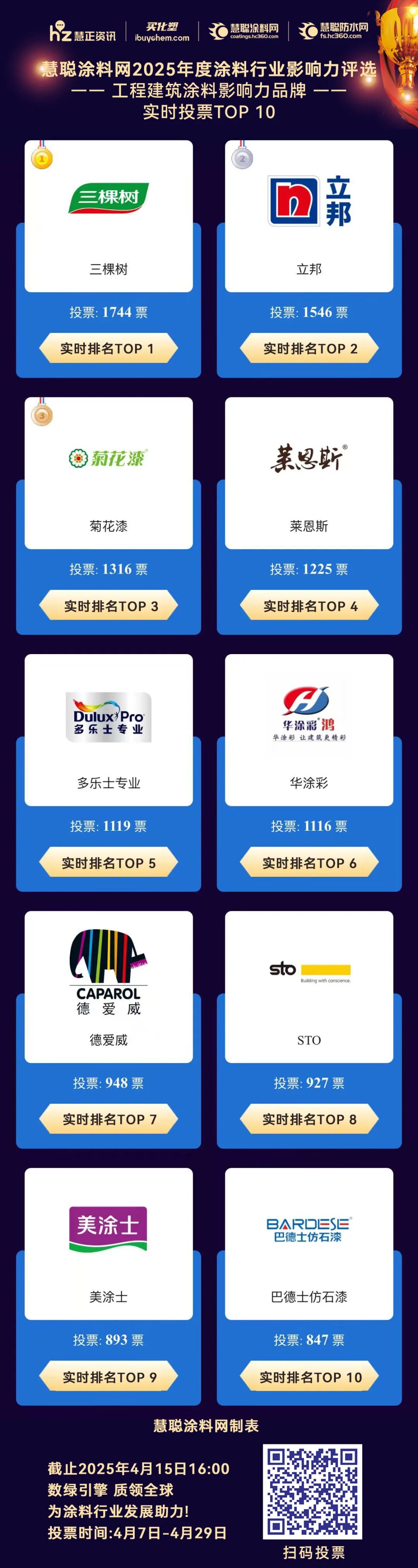截止4月15日16:00,“2025年度涂料行业影响力品牌”各奖项投票排名前十的企业播报: