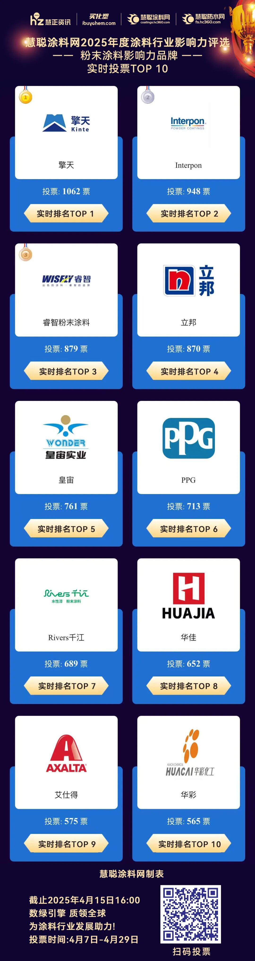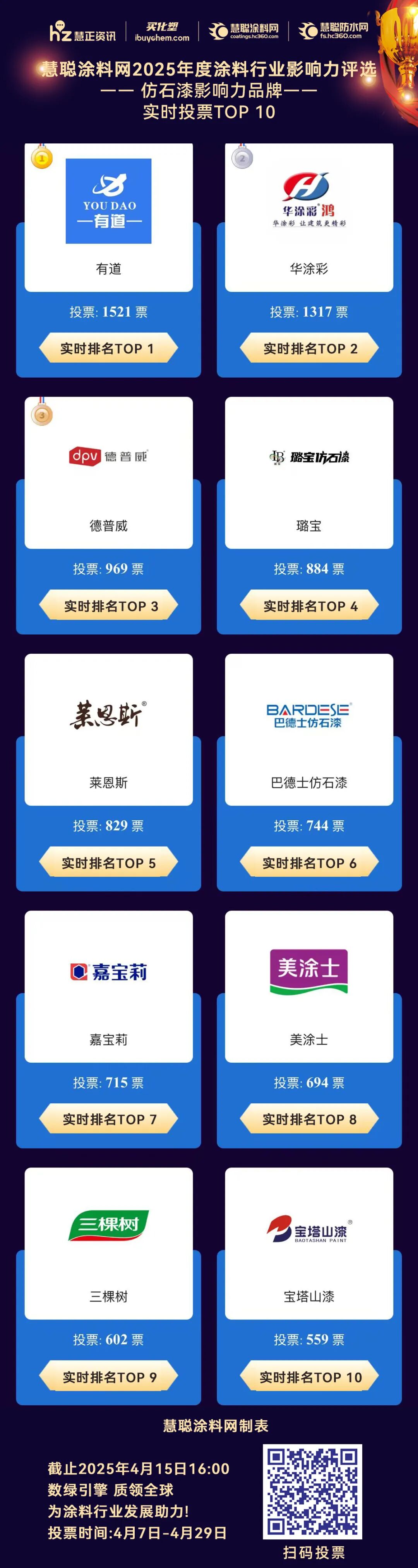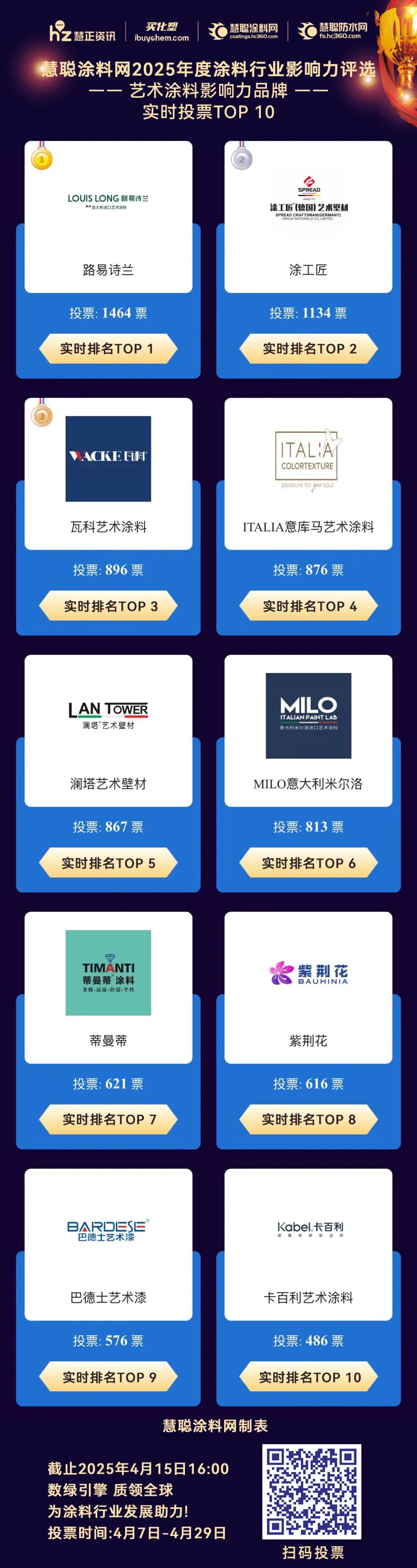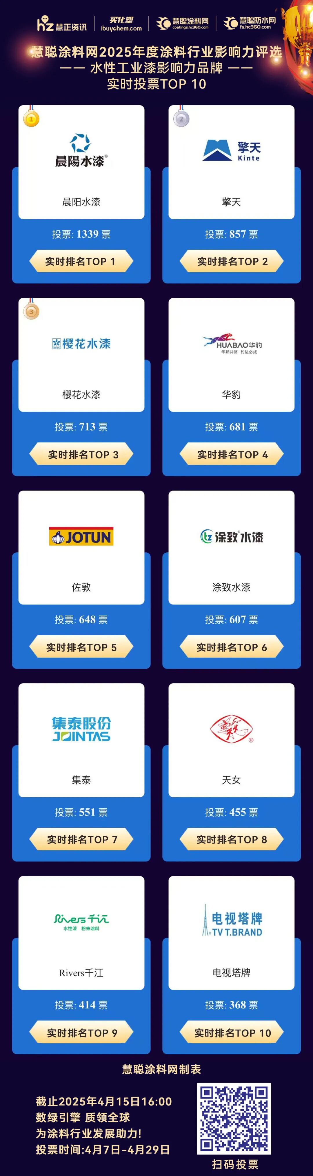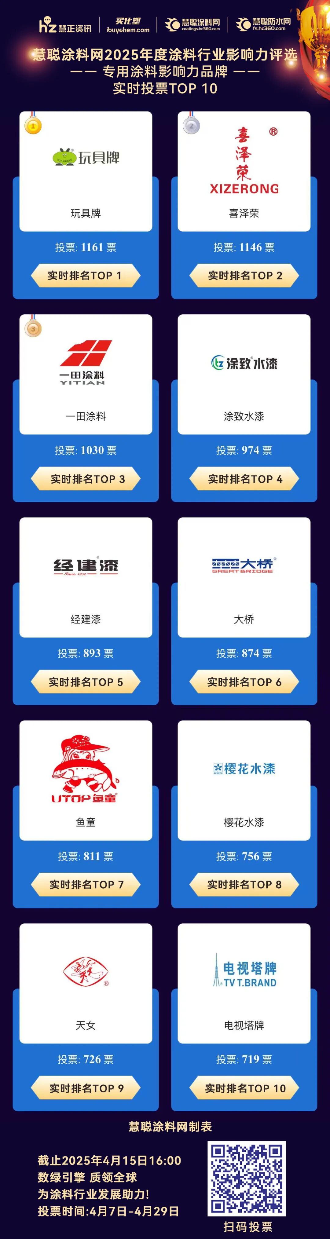 截止4月15日16:00,“2025年度涂料行业影响力品牌”各奖项投票排名前十的企业播报: