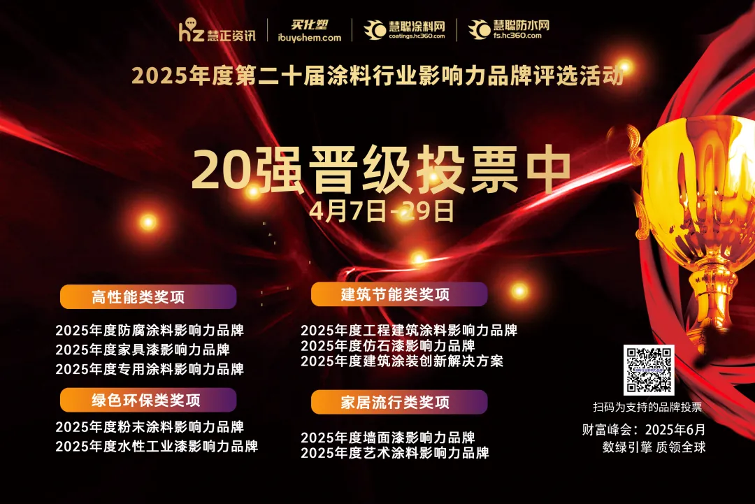 本届“2025年度涂料行业影响力品牌评选”正是对这些涂料品牌企业品牌影响力的一次大考。从4月7日持续到4月29日,您每天可为心目中的优秀品牌投上宝贵的1票,登陆买化塑或者慧正资讯会员,每天可投5票。通过网络投票排名确定的20强入围企业。