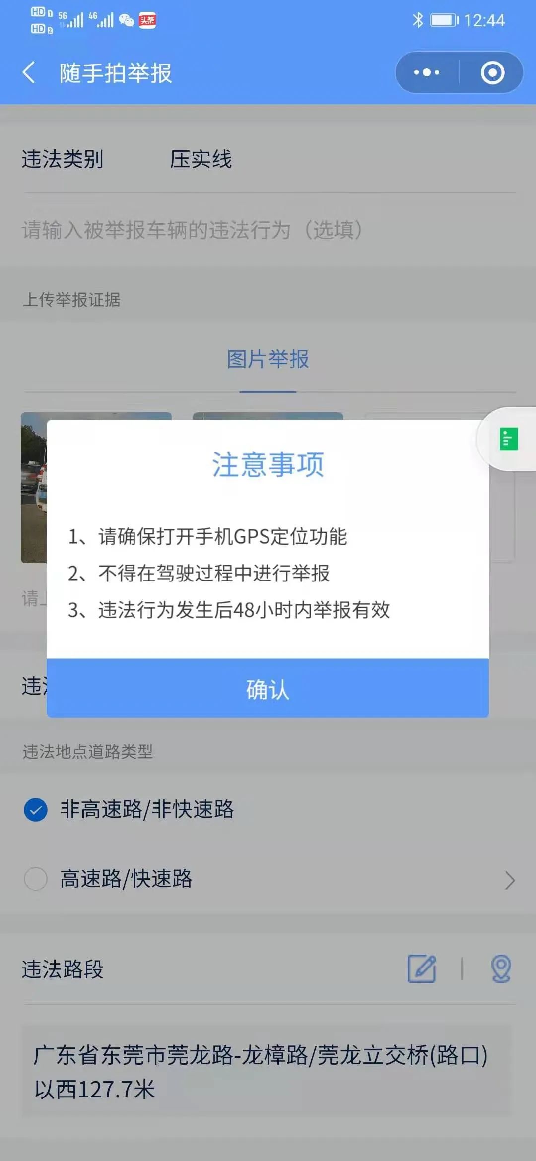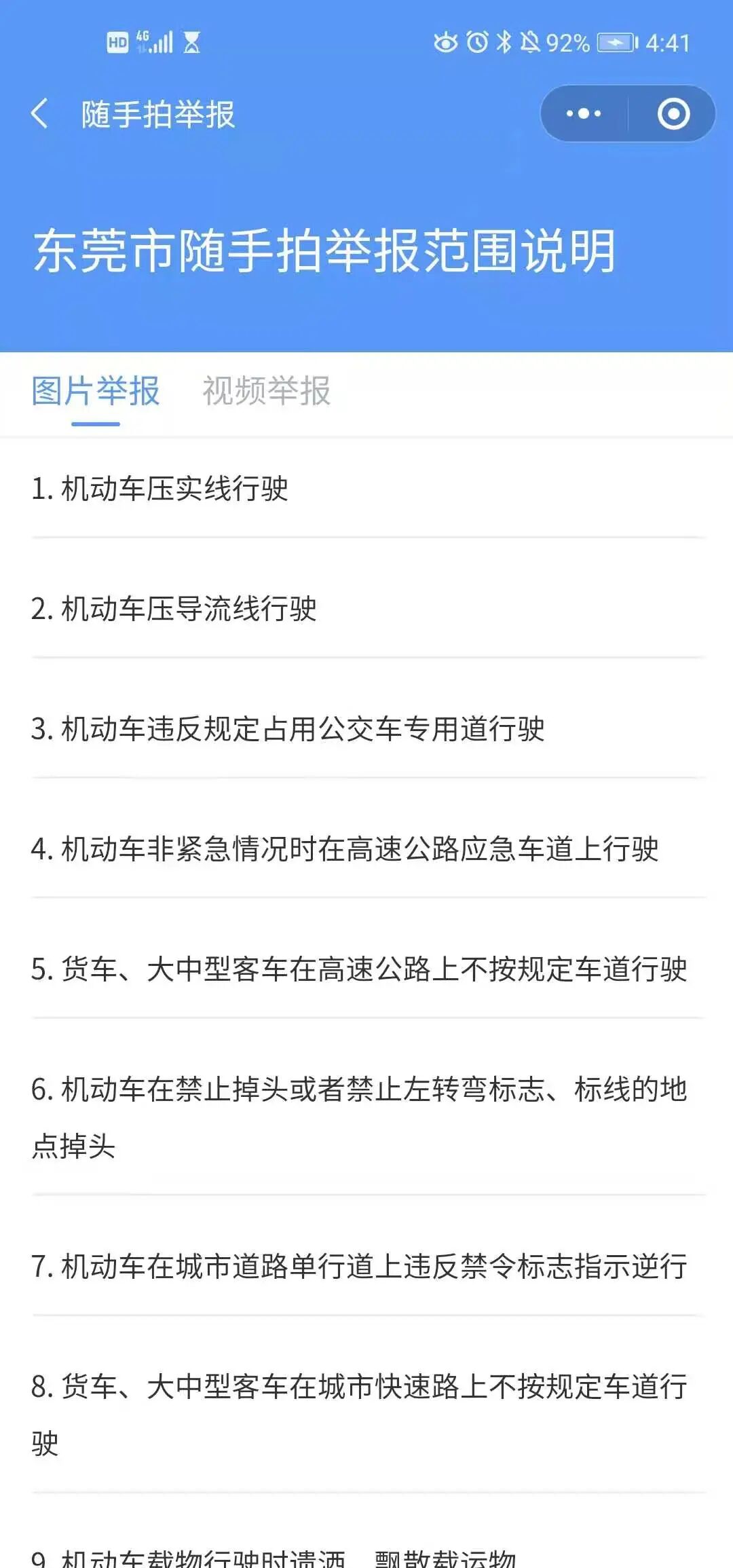 东莞交警部门介绍,举报时要打开手机GPS定位功能,举报机动车行驶状态下的违法行为,需要确保有明确位移。进行图片举报时,要拍摄2张以上(含2张)能记录违法事实的照片。视频举报则要拍摄最小时长不小于5秒,最大时长不超过30秒的连续、不间断且能记录违法事实的视频。