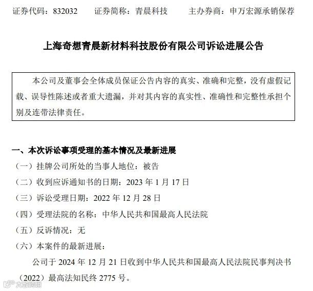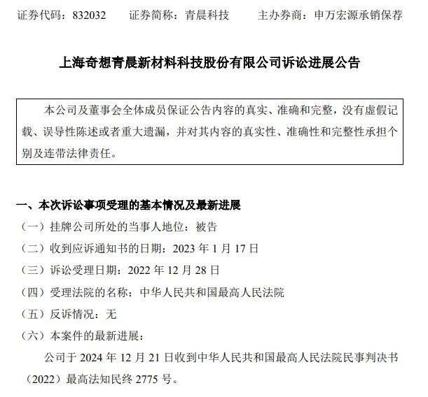 慧正资讯,12月23日,上海奇想青晨新材料科技股份有限公司(青晨科技)近日发布公告,更新了其涉及的知识产权诉讼案的最新进展。根据中华人民共和国最高人民法院的终审判决,青晨科技及其关联方被裁定停止侵害原告上海优漫新材料科技有限公司的技术秘密,并需赔偿经济损失245万元。