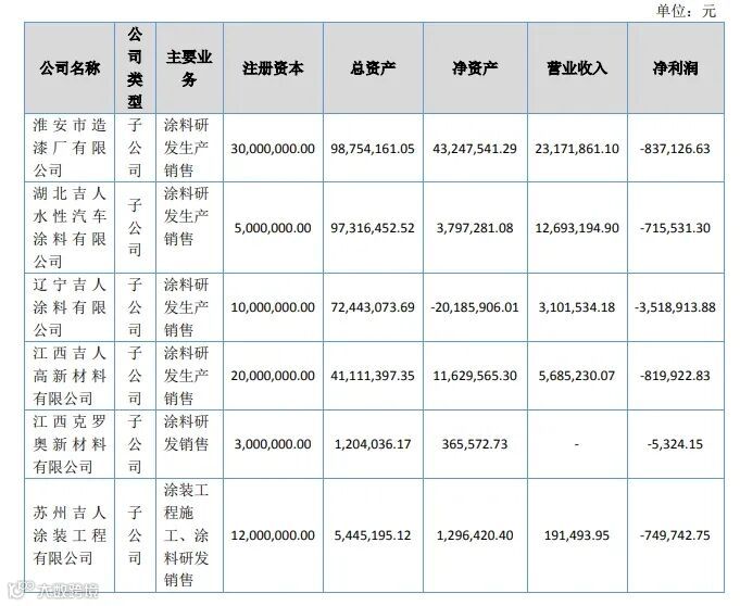 其中,淮安市造漆厂有限公司报告期内实现营收2317.19万元,净利润亏损83.7万元;湖北吉人水性汽车涂料有限公司报告期内实现营收1269.32万元,净利润亏损71.55万元;辽宁吉人涂料有限公司报告期内实现营收310.15万元,净利润亏损351.89万元;江西吉人高新材料有限公司报告期内实现营收568.52万元,净利润亏损81.99万元;江西克罗奥新材料有限公司报告期内净利润亏损5324元;苏州吉人涂装工程有限公司报告期内实现营收19.15万元,净利润亏损74.97万元。