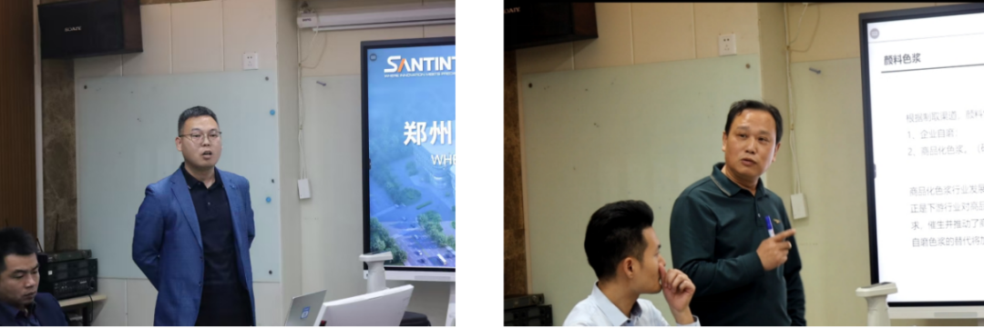 此外,郑州三华科技实业有限公司销售总监孟宇也带来了《智能调色机演示及讲解》的主题报告。孟总监详细介绍了调色机在性价比、性能以及绿色环保等方面的优势,并指出调色机能够根据不同规格的产品进行精准匹配,展现了其出色的调色能力。这一报告进一步增强了考察团对智能调色技术的信心与期待。科迪总工刘敏则分享了色浆自磨的好处以及色漆去研磨环节的可行性探讨,这一话题引发了与会者的热烈讨论。