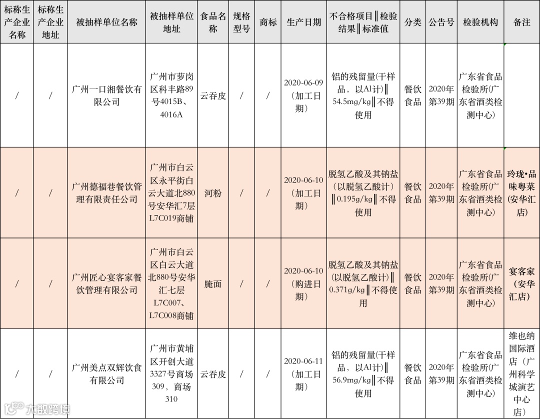 根据抽检地址信息显示,其中2家上榜企业,分别为位于安华汇的宴客家与玲珑•品味粤菜。被抽检不合格的腌面与河粉,也多为广东食客经常会吃的食品。据了解,脱氢乙酸及其钠盐是一种常见的防腐剂,对霉菌、酵母菌等具有很好的抑制作用,广泛用于食品的防腐保鲜。生产企业超范围添加脱氢乙酸及其钠盐主要原因是要延长产品的保质期,防止产品变质。