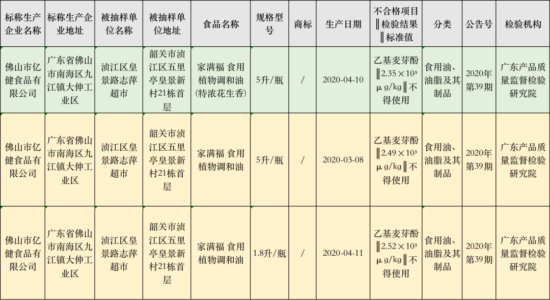 佛山市亿健食品有限公司生产的3批次家满福食用植物调和油不合格,被检出非法添加乙基麦芽酚。据了解,《食品安全国家标准 食品添加剂使用标准》(GB 2760-2014)中规定,植物油脂中不得添加食品用香精香料。