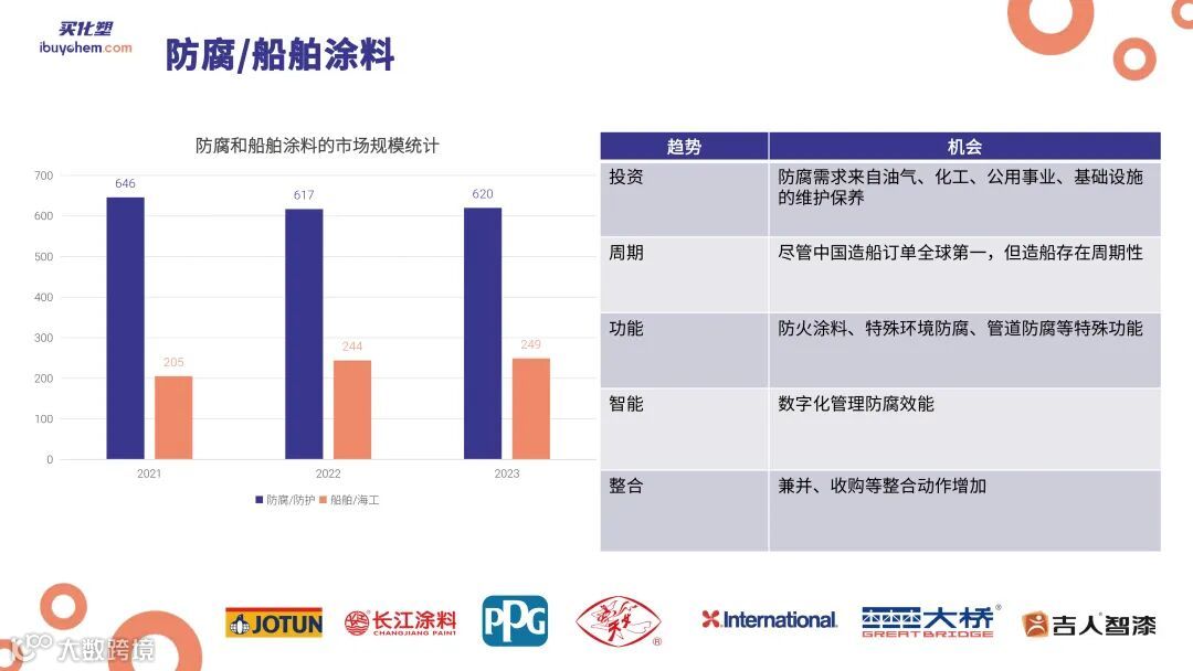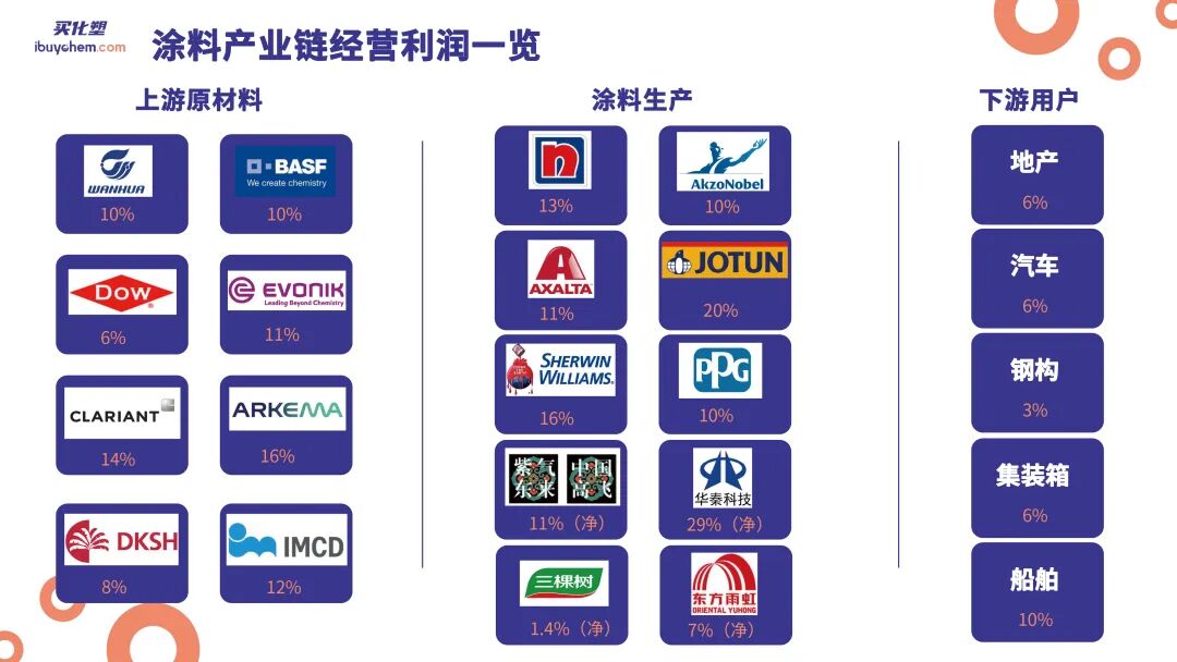 在产业链的利润分配上,上游原材料制造商如万华、巴斯夫等保持着相对稳定的利润空间,而贸易商如大昌洋行、IMCD等则享有8-12%的利润空间。相比之下,涂料厂的利润空间差异较大。一些知名品牌如三棵树和东方雨虹的净利润空间相对较低,而立邦、阿克苏诺贝尔、艾仕得等企业的利润空间则更为可观。特种行业如船舶涂料和军工涂层产品的利润空间则更高,显示出这些领域的盈利能力较强。