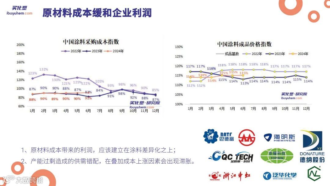 再观察过去三年原材料采购成本,我们发现了一个显著的现象:尽管去年销售量大幅增长,销售额却出现下滑,但企业的利润却有所改善。这一改善主要归因于原材料成本的显著下降。从2022年到2023年,原材料成本下降了近30%,这意味着涂料企业的利润空间相应增加了30%。因此,尽管市场呈现出降价竞争和销售量增长的态势,产值下滑,但利润水平仍然得到了提升。