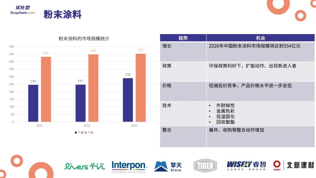 根据买化塑研究院的数据,2023年中国涂料产量达到3630万吨,但产值销售额仅为4158亿,显示出产量上升而产值快速下降的趋势,这也反映出了企业间价格竞争的激烈程度。与此同时,国际涂料市场在过去四年内呈现出较为平稳的增长态势,产值增长率在2021年至2023年间分别为8%、11%、3%,2024年预计将增长4%,从数据对比我们不难看出中国涂料市场和全球涂料市场之间的极端变化。