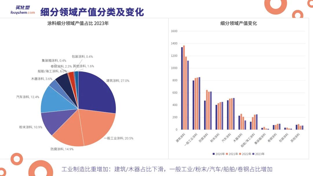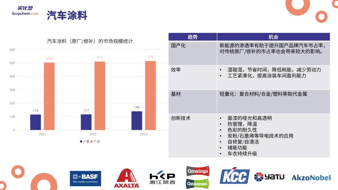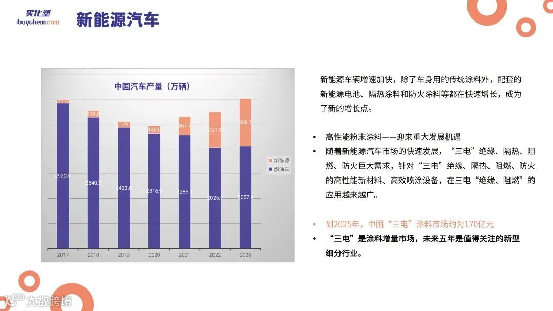 在中国市场内部,各细分领域的表现也不尽相同。建筑涂料和家居装饰类涂料(尤其是木器涂料)的市场份额在减小,而工业涂料和汽车涂料则因制造业和汽车行业的发展而有所增长。特别是,随着电动汽车(EV)的兴起,汽车涂料产量增长迅速。