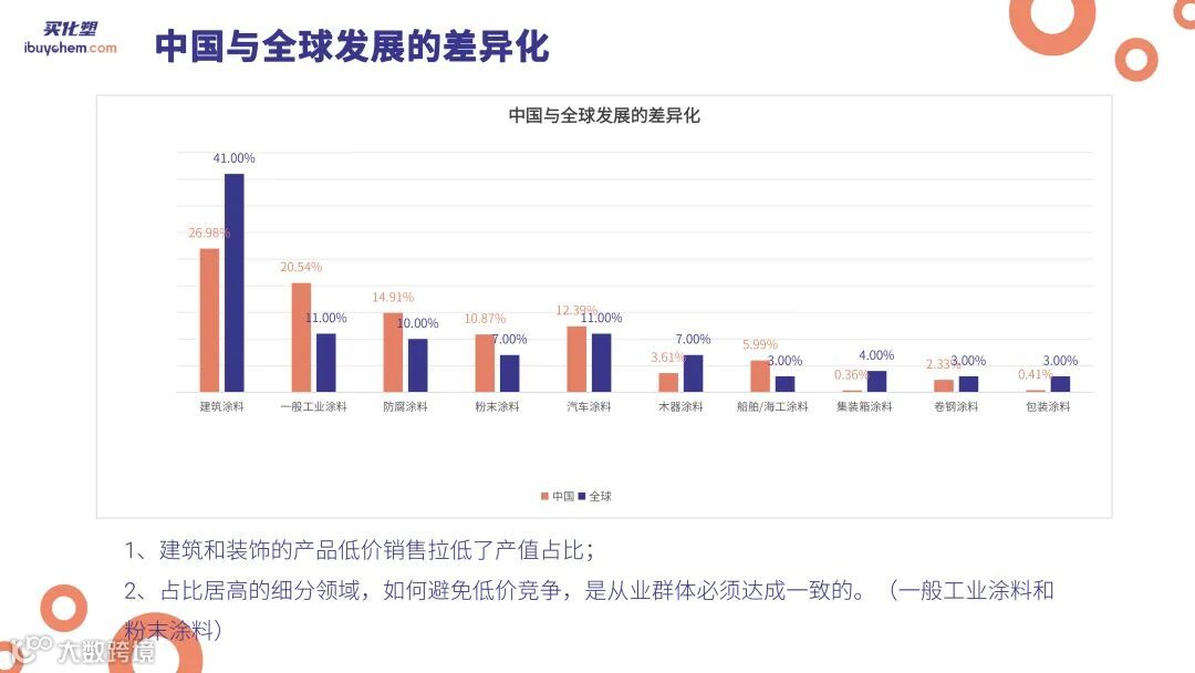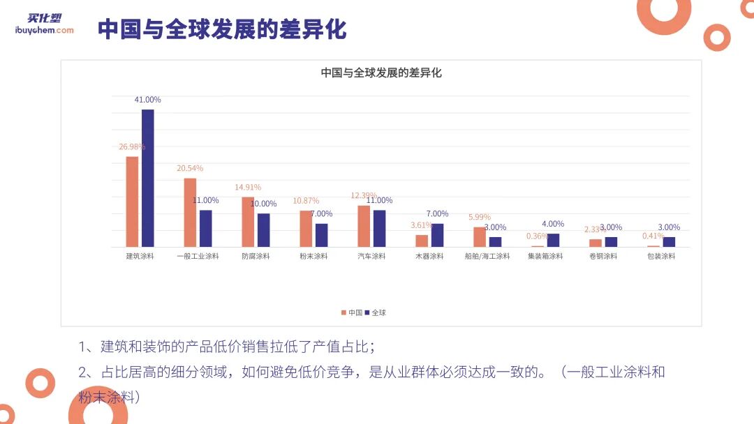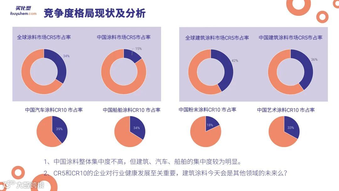 通过对比中国和全球市场的市占率,我们发现中国市场相对分散,而全球前五大涂料企业的市占率达到34%,相比之下,中国前五大企业仅占据15%。不过,在建筑涂料、汽车涂料和艺术涂料等领域,中国排名靠前的企业已经占据了相对可观的市场份额。