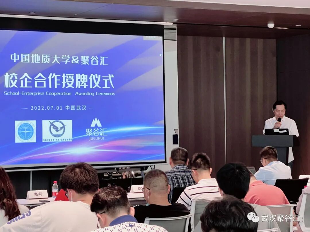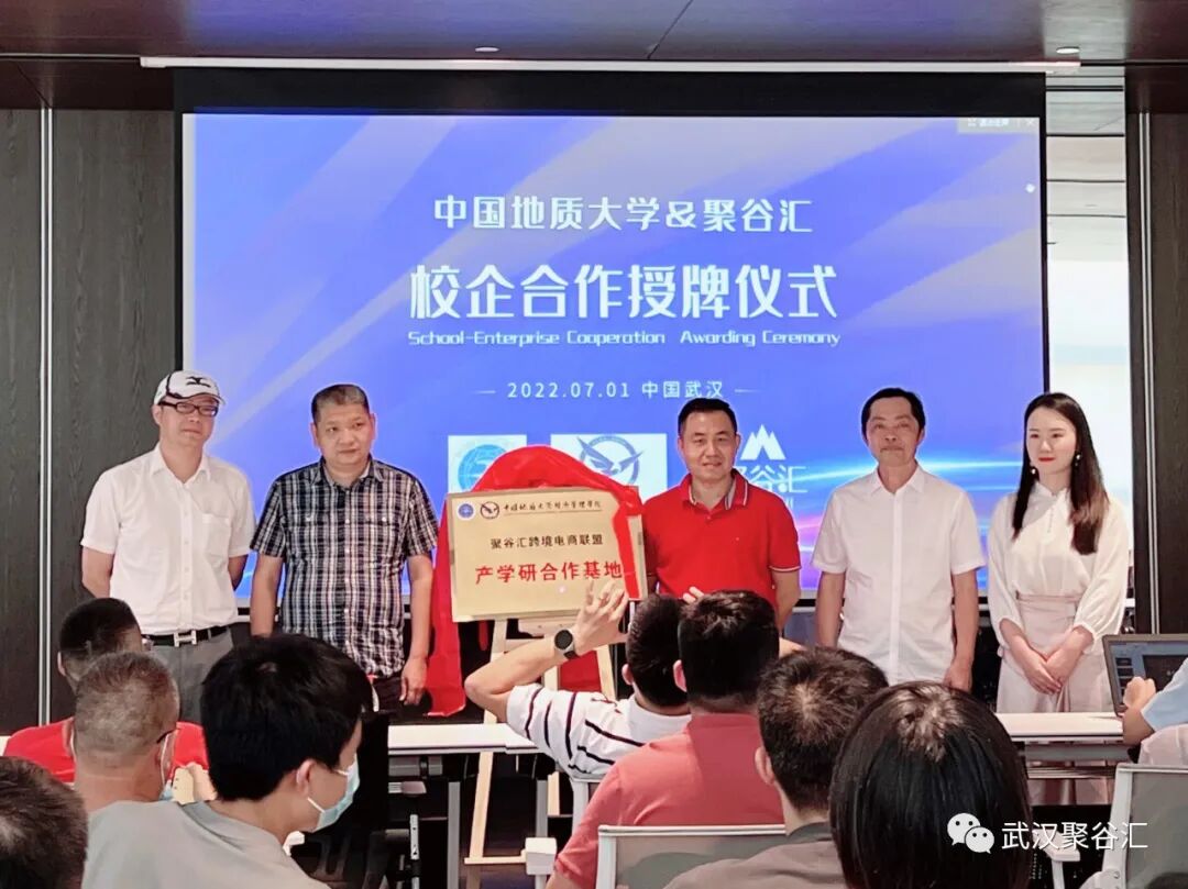 值此建党周年之际,给大家宣布个好消息,为深化中国地质大学与聚谷汇跨境电商联盟的长期校企合作关系,为此隆重举办了校企合作授牌仪式。参与揭牌仪式的嘉宾有高铁商务区领导 陈克超、长江国贸总经理 齐宏伟、中国地质大学经济管理学院副院长 王广民、聚谷汇创始人 湖北跨境电商产教联盟主席 易龙、金茂武汉营销及商业管理部副总经理 赵虹。