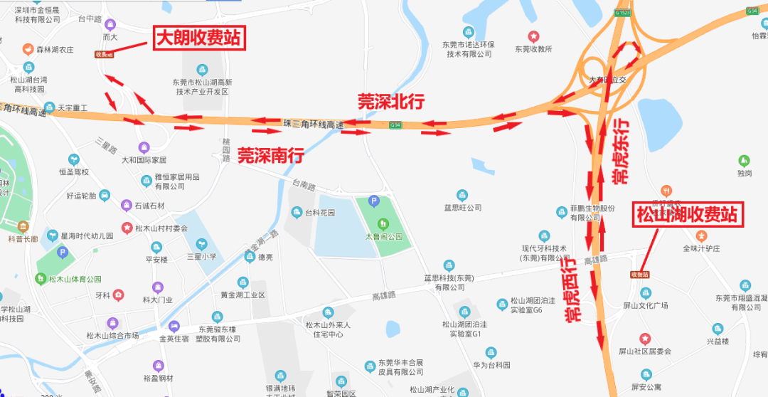 常虎高速东行往松山湖站车辆在大岭山收费站或在大有园立交转莞深高速北行方向由大朗收费站出。