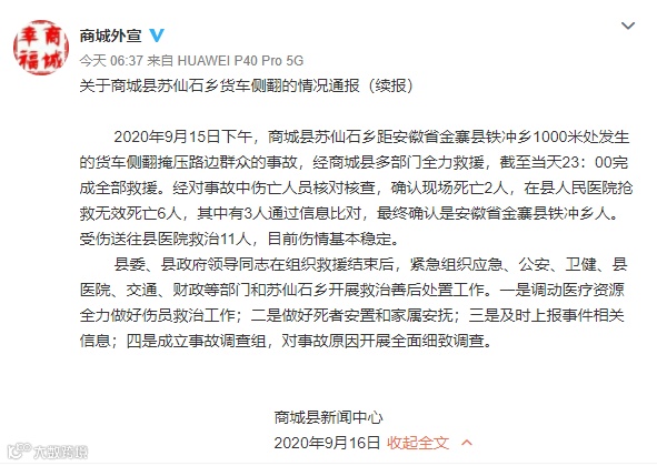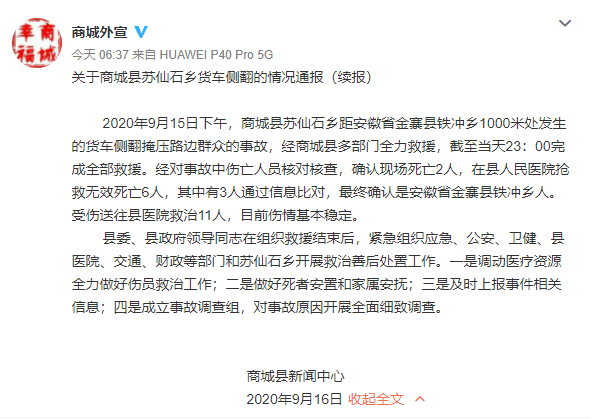 河南省信阳市商城县融媒体中心官方微博9月16日消息,2020年9月15日下午,商城县苏仙石乡距安徽省金寨县铁冲乡1000米处发生的货车侧翻掩压路边群众的事故,经商城县多部门全力救援,截至当天23:00完成全部救援。
