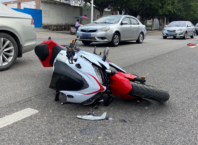 而就在此时,闫某驾驶一辆摩托车从后方疾驰而来。但因前方车辆变道加塞,原本的行驶路线被阻,出于本能反应,闫某进行变向躲避。可由于车速过快,未能使车身与车头保持平稳,最终导致闫某摔车跌倒。