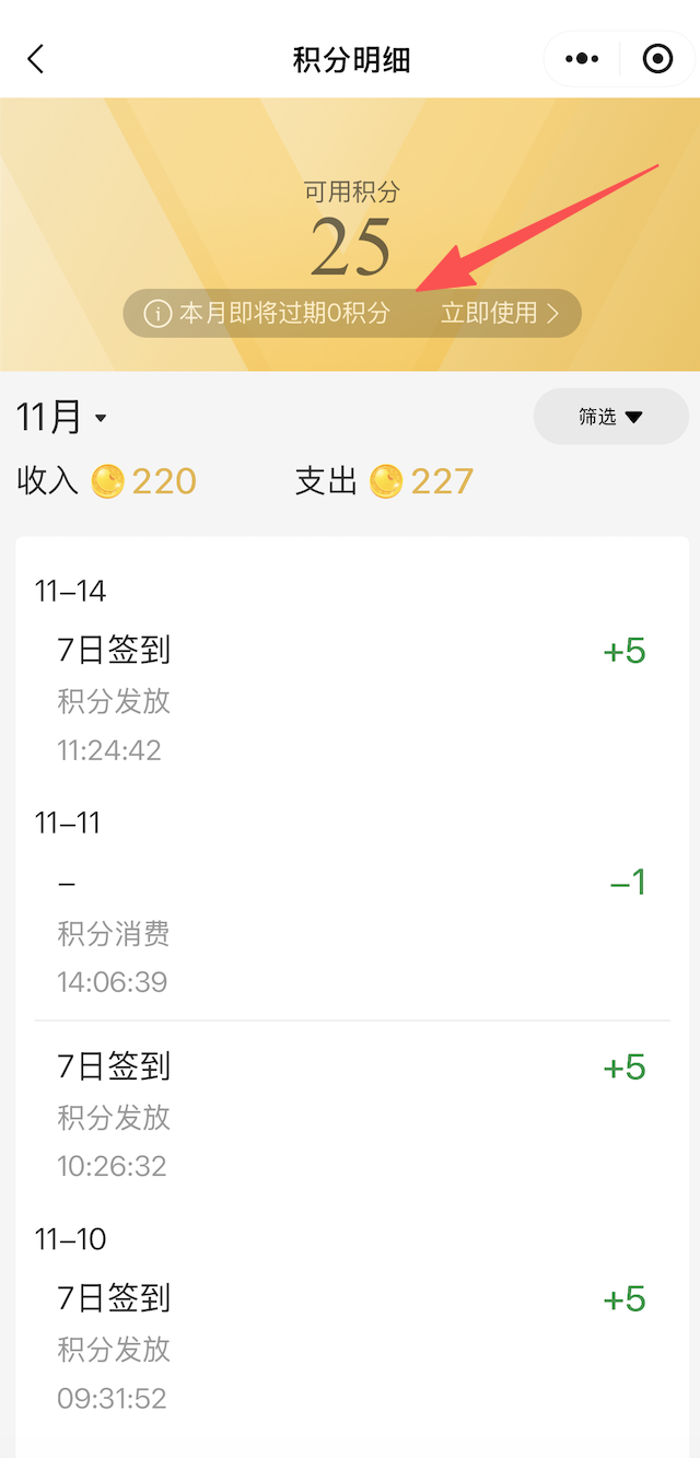 ③点击“积分”,进入“积分明细”,即可查看当前积分余额及过期时间。