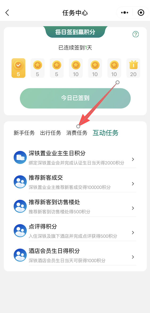 ②更多任务:新手任务、出行任务、消费任务、互动任务,都可获得不同数量的积分,详情可在“任务中心”查询。