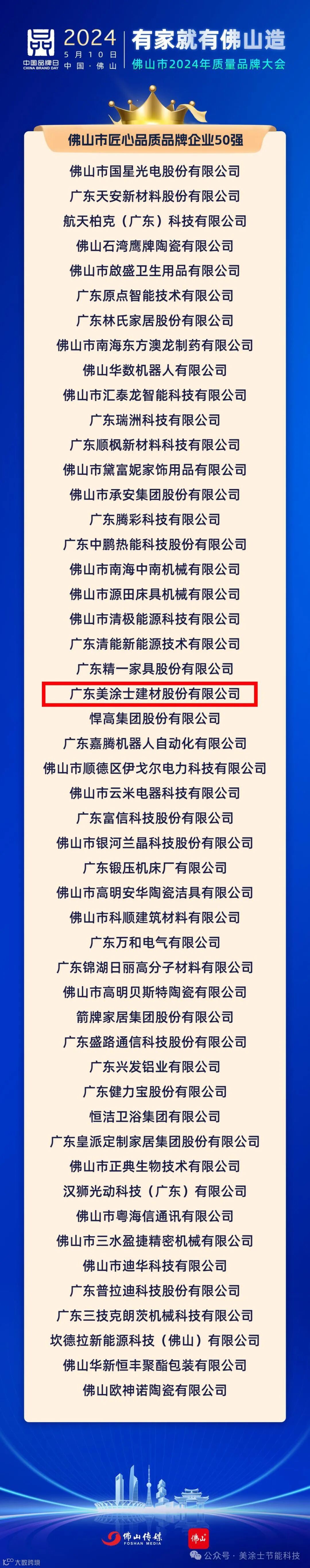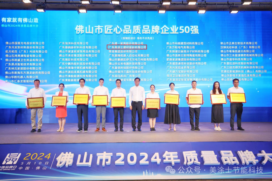 此次活动主要颁布“佛山制造”品牌系列榜单,以及“佛山市企业首席质量官质量创新十大优秀案例”,以此树立一批品牌标杆,挖掘一批品牌人物,讲好佛山品牌故事。美涂士凭借行业领先的综合实力荣获”佛山市匠心品质品牌企业50强“。