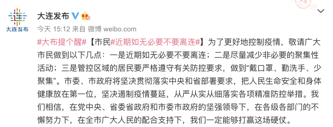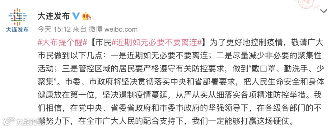 7月23日,大连市统筹推进新冠肺炎疫情防控和经济社会发展工作指挥部召开会议。会议指出,大连市连续出现新冠肺炎确诊病例,疫情防控形势严峻。全市迅速进入战时状态,全力以赴、全民动员,坚决遏制疫情蔓延。