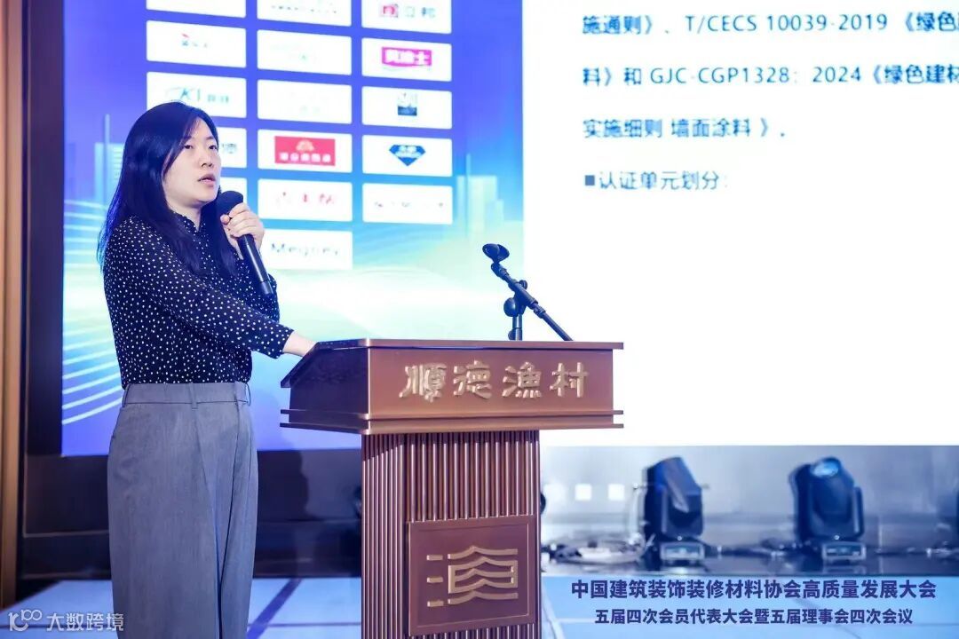 国家建筑工程质量检验检测中心、国家化学建材测试中心、检测院院长王志霞则为大家带来了《建筑涂料国家抽检及相关认证实验方法解析》。王志霞详细阐述了CCC标准检测的依据与抽样要求,解析了国家抽检的最新动态及相关环保认证的具体标准与比较,同时展望了检测标准未来的发展趋势,为建筑涂料企业的质量控制提供了宝贵的参考和指导。