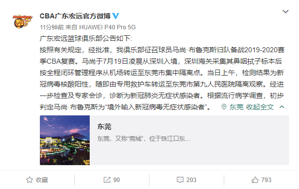 按照有关规定,经批准,我俱乐部征召球员马尚·布鲁克斯归队备战2019-2020赛季CBA复赛。马尚于7月19日凌晨从深圳入境,深圳海关采集其鼻咽拭子标本后按全程闭环管理程序从机场转运至东莞市集中隔离点。当日上午,检测结果为新冠病毒核酸阳性,随即由专用救护车转运至东莞市第九人民医院隔离观察。经进一步检查及专家会诊,诊断为新冠肺炎无症状感染者。根据流行病学调查,初步判定马尚·布鲁克斯为“境外输入新冠病毒无症状感染者”。