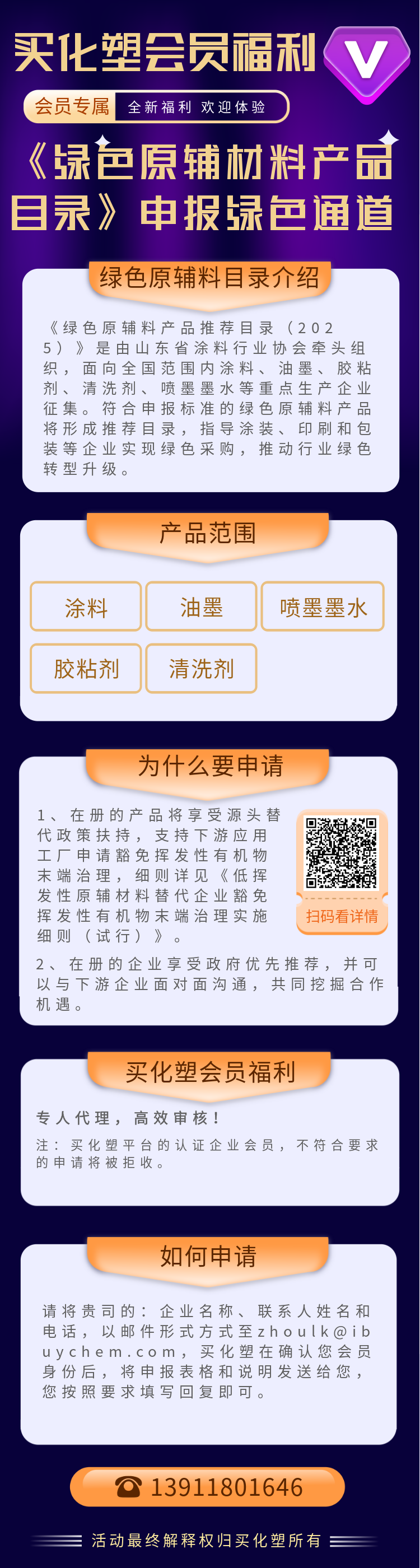 买化塑作为《绿色原辅材料产品推荐目录(2025)》的编制单位之一,为平台会员提供一站式的申报服务,凡产品品类和环保性能符合申报要求的平台企业,可与为您服务的买化塑员工进行联系,平台将全程协助企业完成推荐目录的申报。