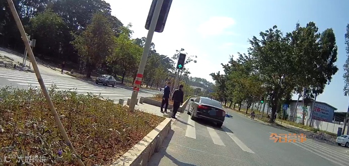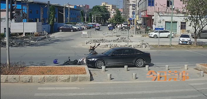 两个闺蜜骑在一个电动车,没有戴头盔,横穿公路的时候和一个小汽车发生交通事故,造成两个人受伤。