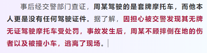 而摩托车在慌忙躲避之际,车身一摆,更是把侧坐在后座的黄小姐重重甩在地上,导致其腰椎骨裂。正当黄小姐趴在路中间痛苦不已之际,肇事驾驶人却一加油门,加速逃离了事故现场。幸好身后车辆及时发现倒地不起的伤者,才避免酿成更大的悲剧。