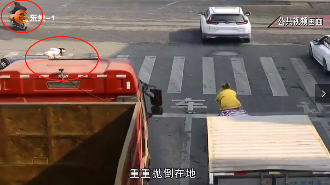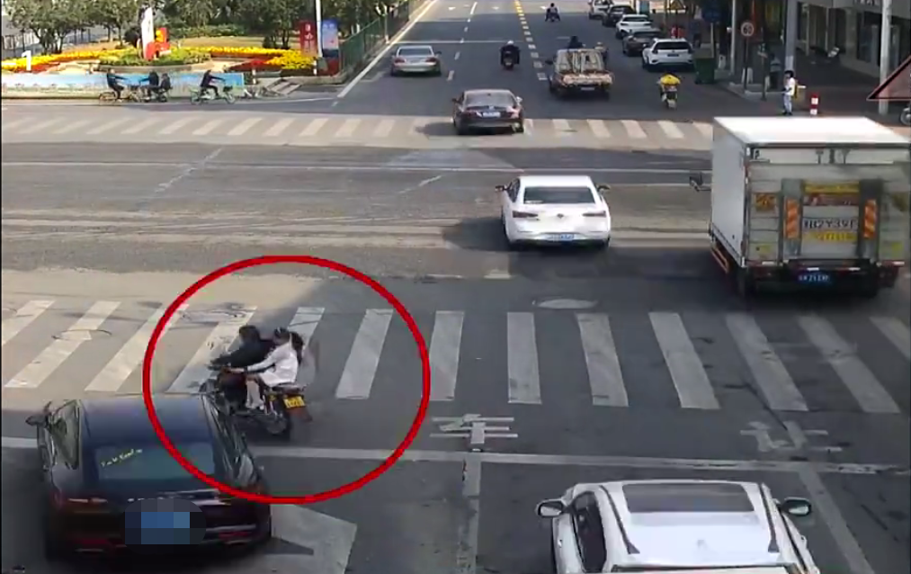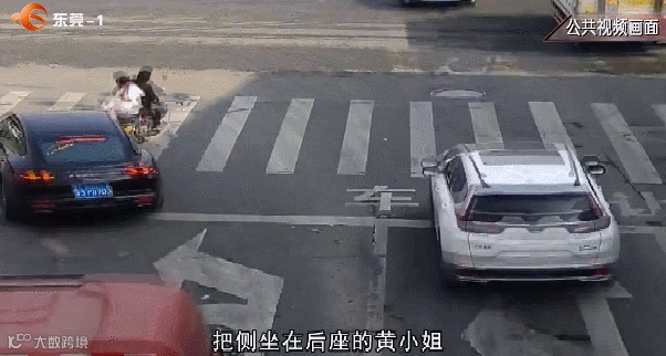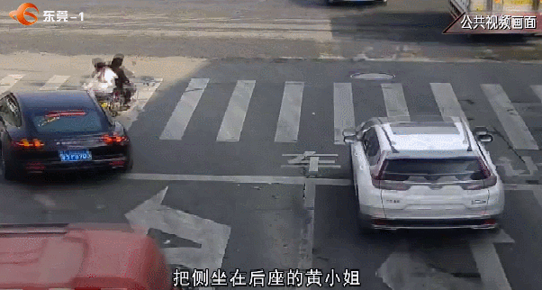 没想到,车辆快到目的地时便发生了意外。从交警部门提供的公共视频监控显示,在车水马龙的东风路与崇焕路交界红绿灯路口,这辆搭载着两人的摩托车“如入无人之境”,从右车道接连跨实线,强行穿越两条车道驶到左边道路,正要左转入东风路时,与一辆正常行驶的小车发生了碰撞,导致该小车车身多处被刮花。