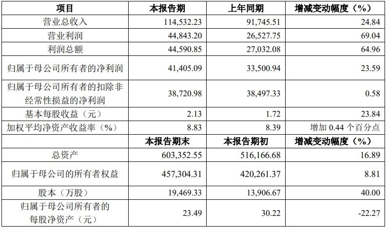 此外,报告期内,公司营业利润较上年同期增长69.04%,利润总额较上年同期增长64.96%,主要系控股子公司上海瑞华晟新材料有限公司2023年确认股份支付费用金额较大所致。报告期内,公司股本较期初增长40%,主要系公司在2024年5月完成资本公积转增股本,转增55,626,668股所致。