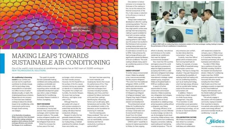家电制造商美的空调团队利用了高质量薄层石墨烯的防腐蚀、高导热、抗菌性能的这项应用,也刊登在今年5月的Nature(《自然》)期刊中。《Making leaps towards sustainable air conditioning》说明了美的空调的相关技术成果。文章详细介绍了“石墨烯超薄涂层技术”的创新性表现。该项技术可提升空调主要部件——换热器翅片的极端耐候性、抗老化能力和耐腐蚀性,并带来更高效的热量交换效率。