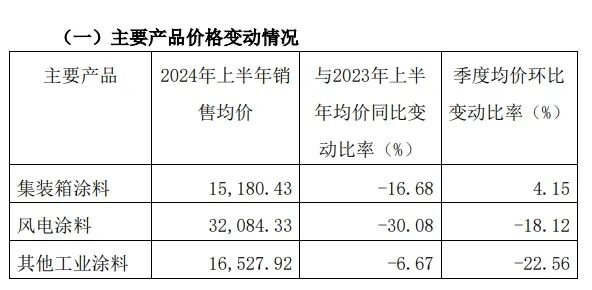 而麦加芯彩本期归属于上市公司股东的净利润及归属于上市公司股东的扣除非经常性损益的净利润减少主要有两方面原因:1、本期集装箱涂料收入增加,但是毛利率尚处于自低向高的恢复阶段,而2023年集装箱涂料由于行业原因则是自高向低,上半年较高、下半年降低,两年价格趋势不同;2、本期风电涂料产品收入和毛利率均有所下降,主要原因在于2024年上半年终端产品价格下降,麦加芯彩涂料产品毛利率有所下降导致。报告显示,报告期内风电涂料产品价格同比下降30.08%。