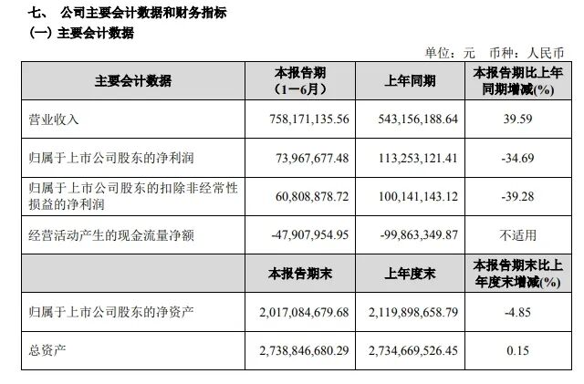 慧正资讯:8月27日,麦加芯彩公布了2024年半年度报告。报告显示,麦加芯彩报告期营业收入为7.58亿元,同比增长39.59%;归属于上市公司股东的净利润为7396.77万元,同比下降34.69%;归属于上市公司股东的扣除非经常性损益的净利润为6080.89万元,同比下降39.28。