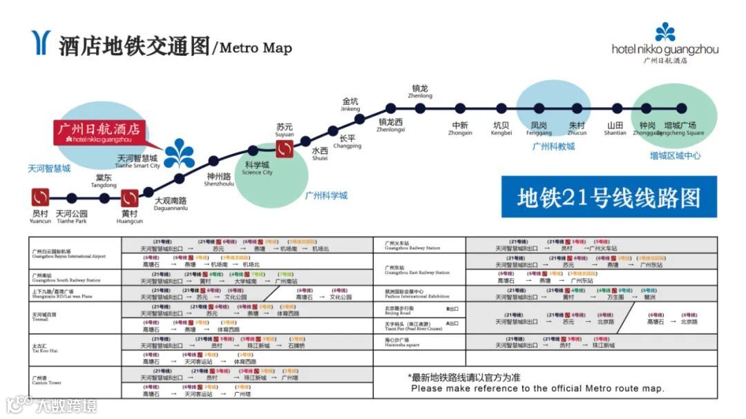 广州白云国际机场、广州南站、广州火车站、广州东站、去往琶洲会展中心等均可乘坐地铁,换乘21号线在天河智慧城站下车,B出口出,具体换乘方式见下图: